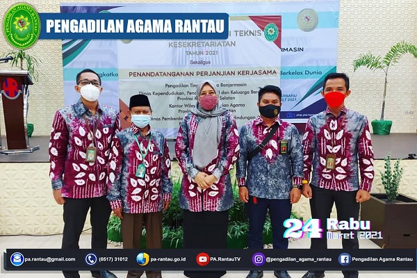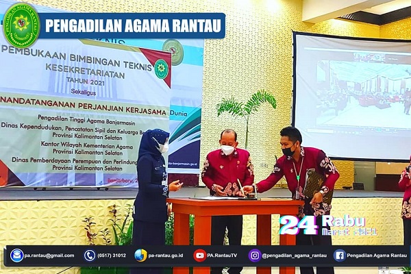 Acara pembukaan Bimtek juga dihadiri oleh Ketua (Rabiatul Adawiah, S.Ag.), Sekretaris (Akhmad Muzakkir, S.H.I.), Panitera (Nanang, S.Ag.) Pengadilan Agama Sekalimantan selatan, dalam acara kali ini juga disisipkan serangkaian acara yang terdiri dari, penandatanganan perjajian kerja sama (MoU) PTA Banjarmasin dengan Dinas Kependudukan, Pencatatan Sipil dan Keluarga Berencana Provinsi Kalimantan Selatan, Kantor Wilayah Kementerian Agama Provinsi Kalimantan Selatan dan Dinas Pemberdayaan perempuan dan Perlindungan Anak Provinsi Kalimatan Selatan yang terdiri dari 2 Mou yakni pertama MoU Perjanjian Konseling Dispensasi Kawin kedua pelaksanaan Sidang Terpadu.