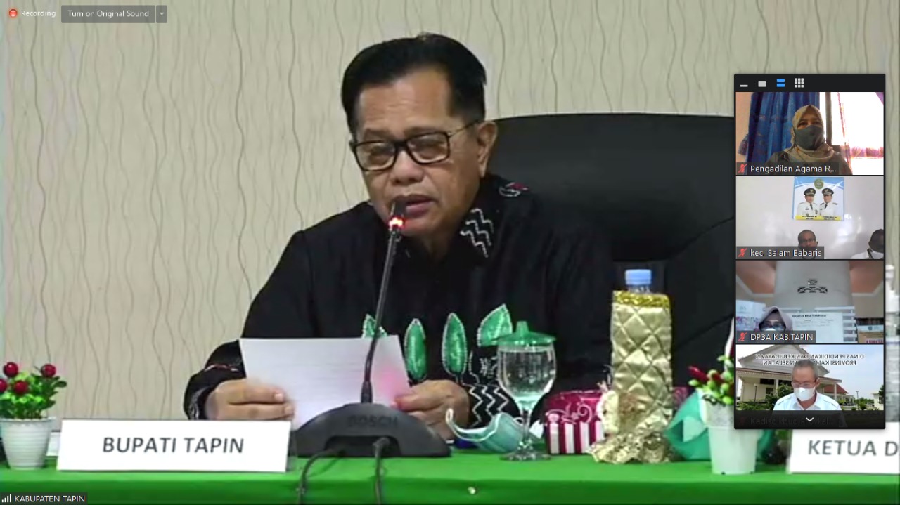 Bupati Tapin H.M Arifin Arpan MM membuka secara resmi musyawarah pembangunan daerah (Musrenbang) RKPD Kabupaten Tapin tahun 2021, rabu (31/03/2021), bertempat di Aula Beppelitbang Kab.Tapin dengan dihadiri tamu undangan melalui Zoom meeting. Meskipun dilaksaakan secara daring acara ini tetap berjalan dengan khidmat dan lancar sebagaimana yang diharapkan. (WHM)